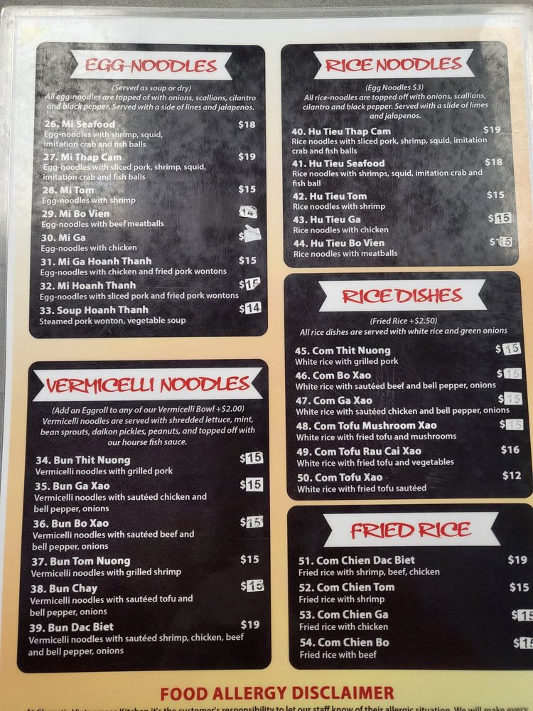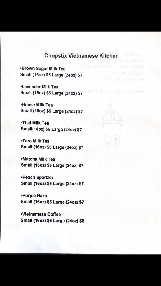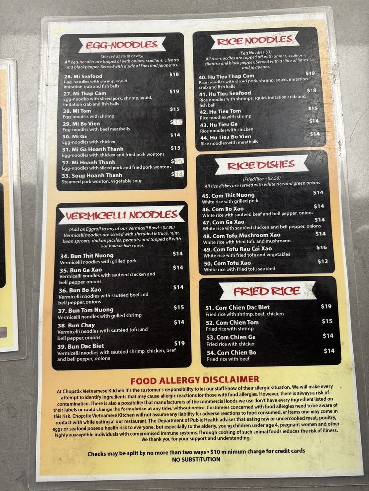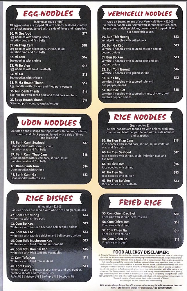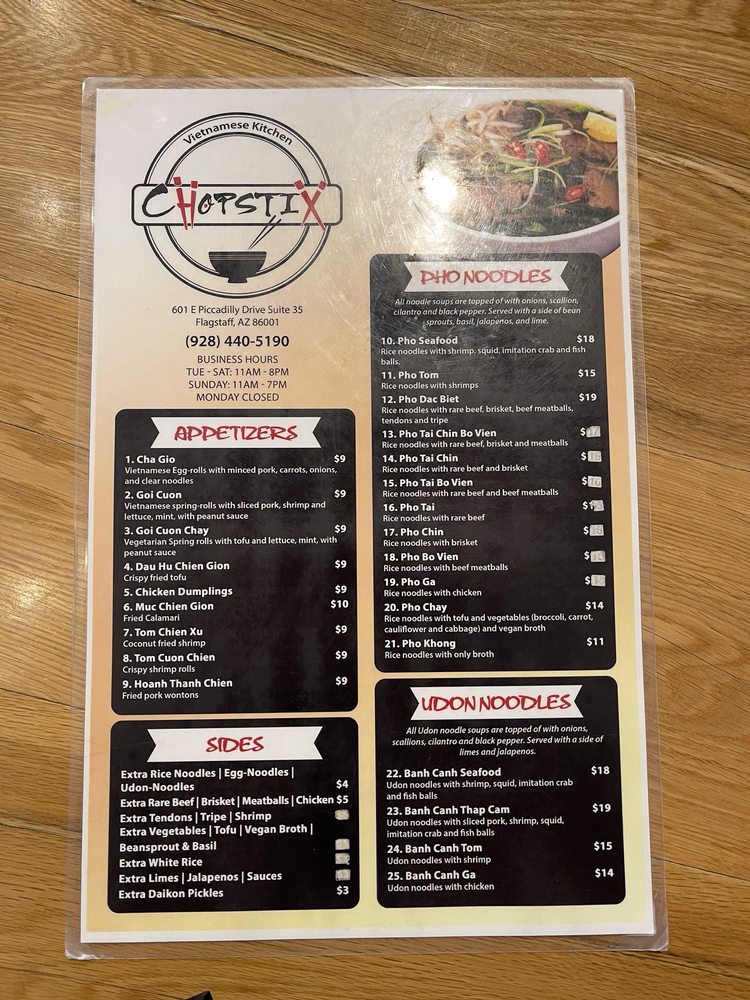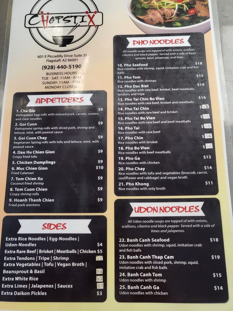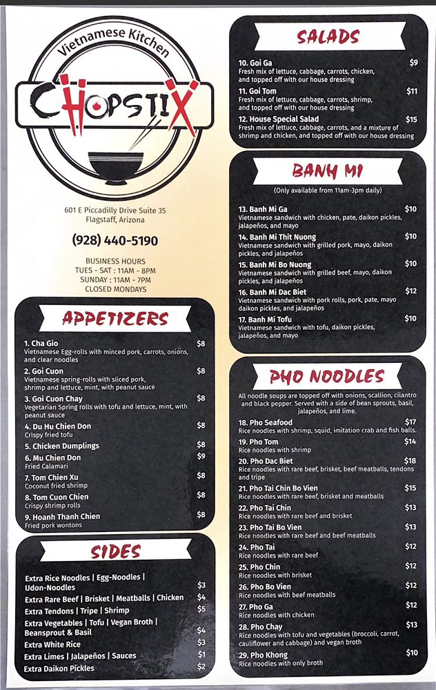 Introducing the menu at Chopstix Vietnamese Kitchen in Flagstaff, AZ. This Asian-owned and women-owned restaurant offers a range of Vietnamese soups, dishes, and bubble teas. With options for vegan diets, wheelchair accessibility, and various payment methods including cryptocurrency, this establishment caters to a diverse clientele. Customers rave about the fresh flavors and quick service, with standout dishes like the Pho Tai impressing even Vietnamese patrons. The modern ambiance and outdoor seating make for a pleasant dining experience, ideal for groups or a casual lunch. Despite being short-staffed at times, the attentive service and complimentary offerings like Thai tea showcase their dedication to customer satisfaction.Visit Chopstix Vietnamese Kitchen for a taste of authentic Vietnamese cuisine in a welcoming setting.